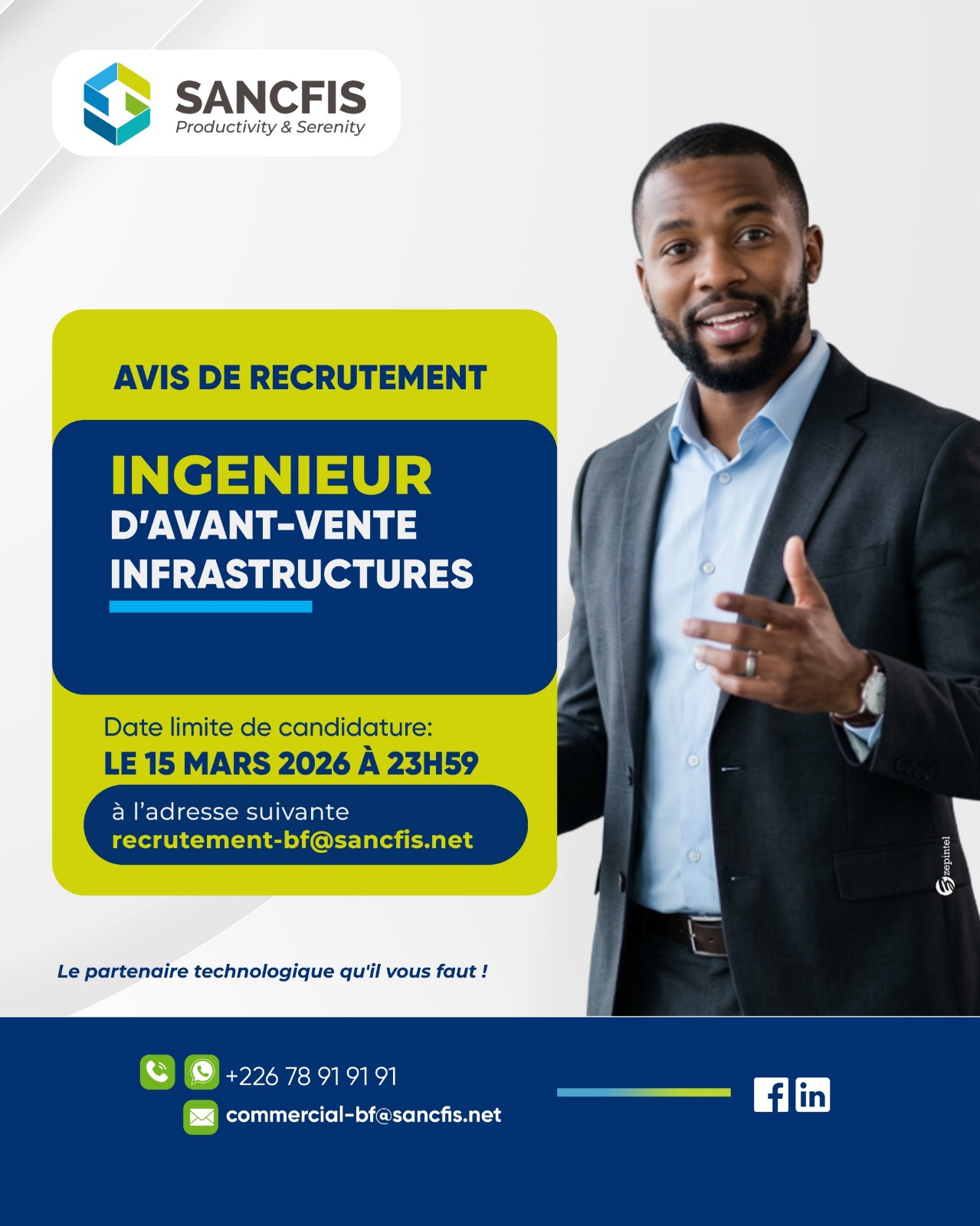 Les dossiers de candidature doivent รชtre envoyรฉs ร lโadresse suivante : recrutement-bf@sancfis.net au plus tard le ๐๐ ๐ฆ๐๐ซ๐ฌ ๐๐๐๐ ๐ฬ ๐๐๐ก๐๐, en mentionnant en objet ยซ ๐ซ๐๐๐ซ๐ฎ๐ญ๐๐ฆ๐๐ง๐ญ ๐โ๐ฎ๐ง ๐๐ง๐ ๐ฬ๐ง๐ข๐๐ฎ๐ซ ๐๐ฏ๐๐ง๐ญ-๐ฏ๐๐ง๐ญ๐ ๐๐ง๐๐ซ๐๐ฌ๐ญ๐ซ๐ฎ๐๐ญ๐ฎ๐ซ๐๐ฌ ยป.